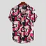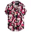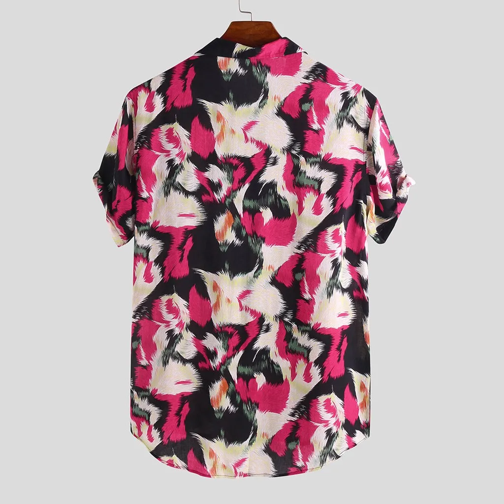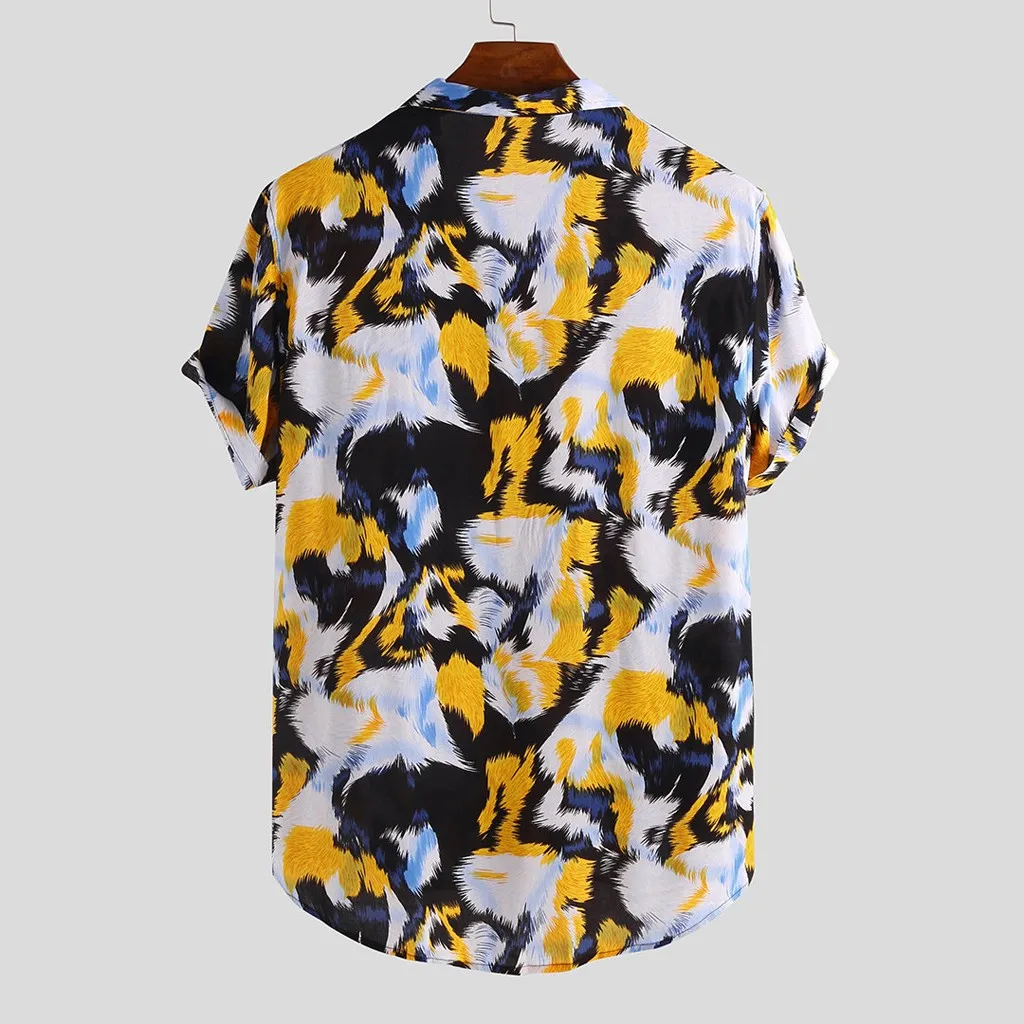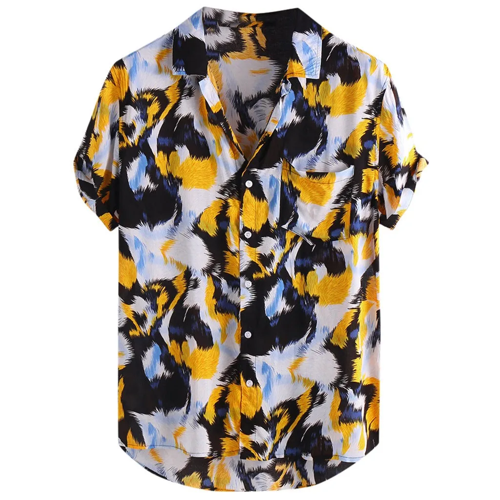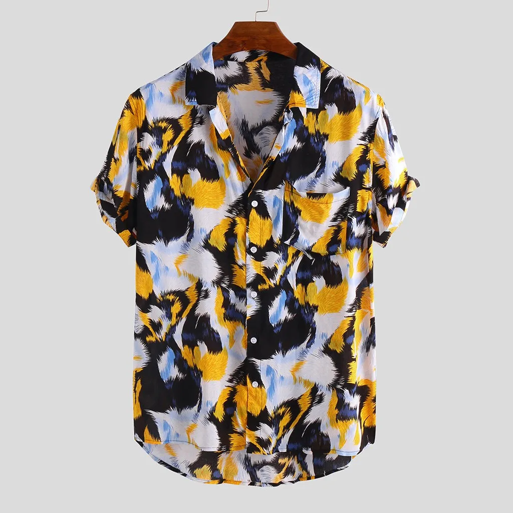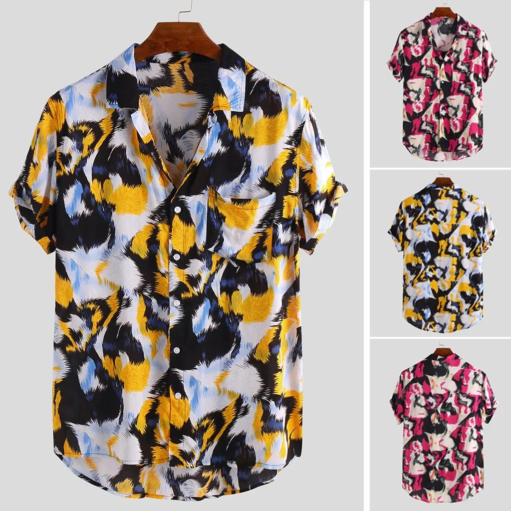 Mens Printed Chest Pocket Turn Down Collar Short Sleeve Casual Loose Shirt
